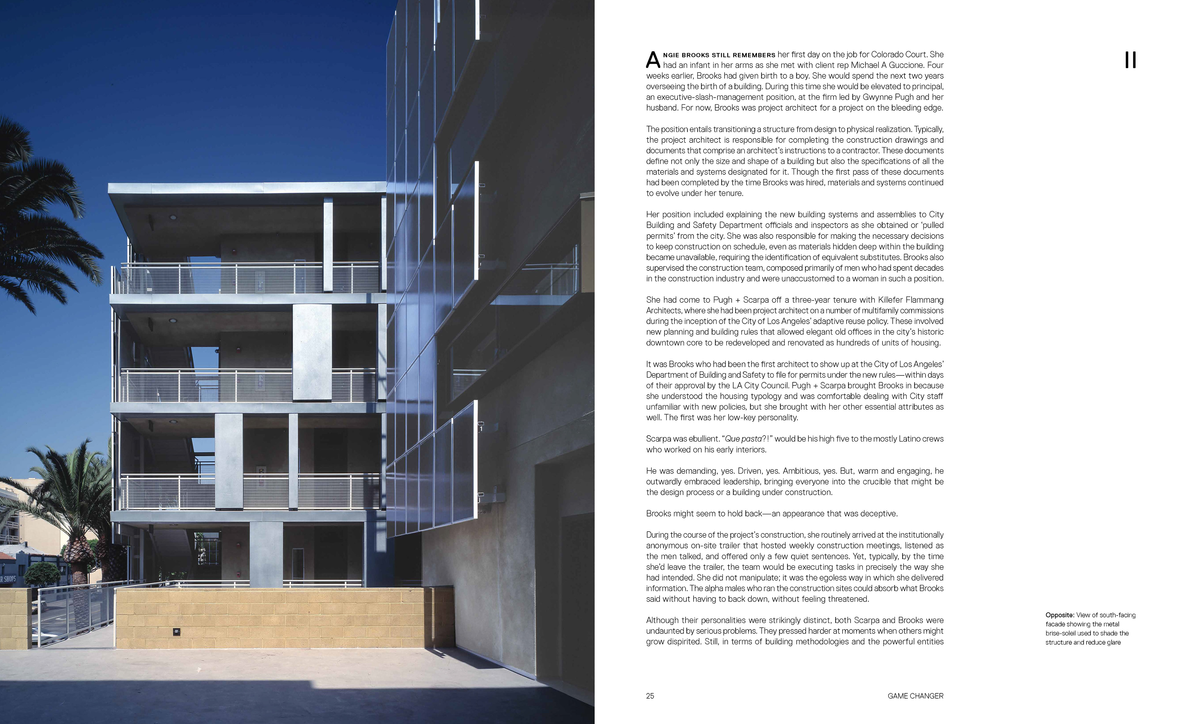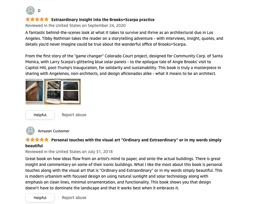 A behind-the-scenes look at what it takes to survive and thrive as an architectural duo in Los Angeles. Tibby Rothman takes the reader on a storytelling adventure - with interviews, insight, quotes, and details you'd never imagine could be true about the wonderful office of Brooks+Scarpa. From the first story of the "game changer" Colorado Court project, designed for Community Corp. of Santa Monica, with Larry Scarpa's glittering blue solar panels - to the epilogue tale of Angie Brooks' visit to Capitol Hill, post-Trump's inauguration, for solidarity and sustainability. This book is truly a masterpiece in sharing with Angelenos, non-architects, and design aficionados alike - what it means to be an architect.
