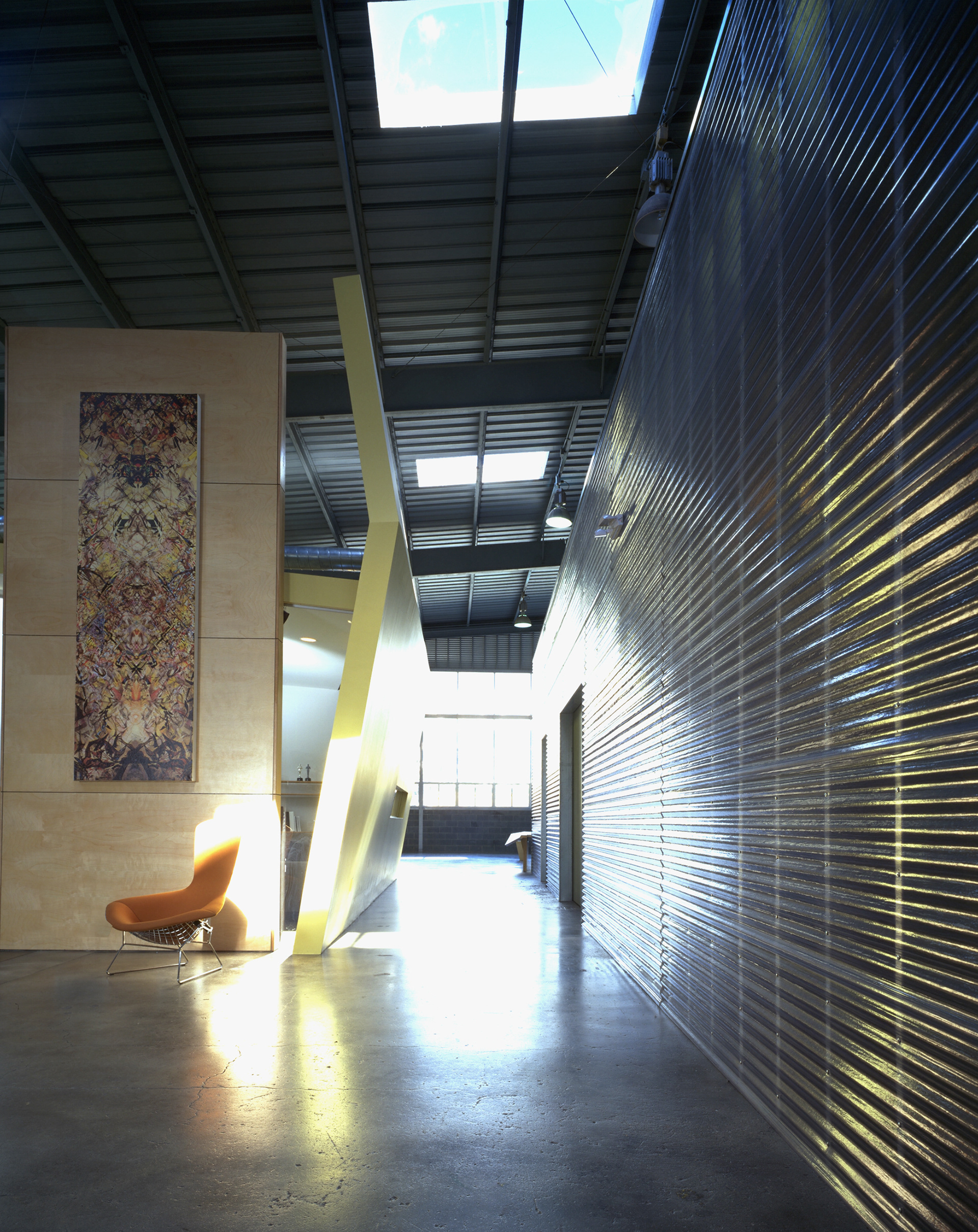 The design for the 9000 square foot Click 3X LA transforms an industrial wasteland into a dramatic setting for a digital effects and animation studio. Located at Bergamot Station, the internationally known art center, this renovation and expansion involved adding 2500 sq. ft. To an existing 6,500 sq. Ft. Industrial building formerly used to manufacture residential water heaters. The dense, technologically-rich program includes Inferno rooms used to create visual effects and computer animation for TV commercials and shows and large format movies. Also included are several other computer animation studios, avid rooms, CGI suites, open production space, conference rooms, executive offices and a machine room housing sophisticated visual effects computers. The architecture confronts the user, while maintaining a spatial continuity and sensation of vastness characteristic of the industrial warehouse buildings at Bergamot Station. Bold, almost primitive, sculptural forms are intentionally large and expressive. Attention was paid to creating unbroken visual corridors that extend the entire length of the space. Simultaneously, the design creates opportunities for more intimate, internally-focused moments. This diversity of spatial experience deftly reconciles both functional needs and the firm’s