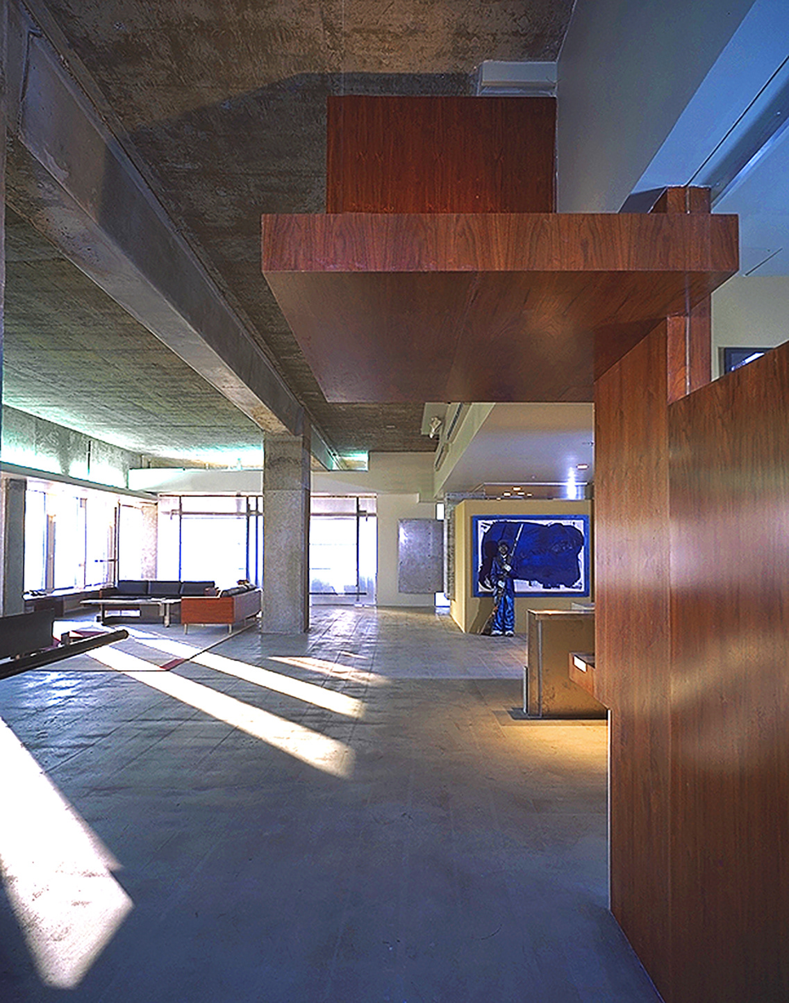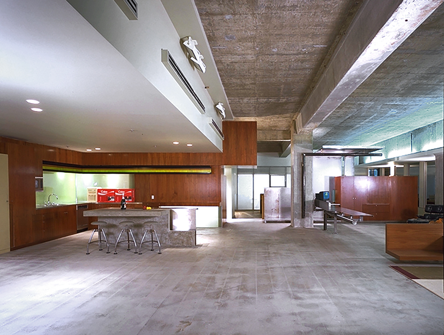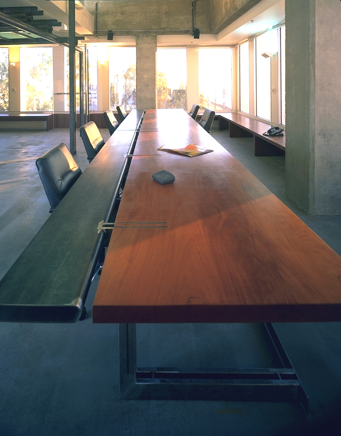 This 14,000 square foot project was to transform an existing commercial interior space into the signature headquarters for a cutting edge artist management company. Located on the 4th floor of a Beverly Hills high-rise, the program includes executive suites for the principals of the company, offices for other members of the executive team, assistants, and support staff, two conference rooms, a kitchen and lounge area, reception and miscellaneous service rooms. The clients for this project needed to occupy a finished space within sixteen weeks from the beginning of the design process. This allowed for a very limited incubation period in which ideas had to be generated and realized. To meet this demand, a systematic working strategy that capitalized on the extreme constraints of the project and a team approach was adopted. Client, contractor and architect collaborated with an unprecedented synergism. Ultimately, the architecture emerged from the inventive and dynamic atmosphere that was cultivated in response to the particular conditions of the project.