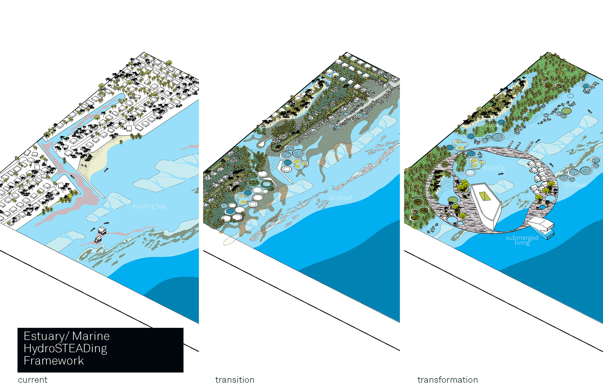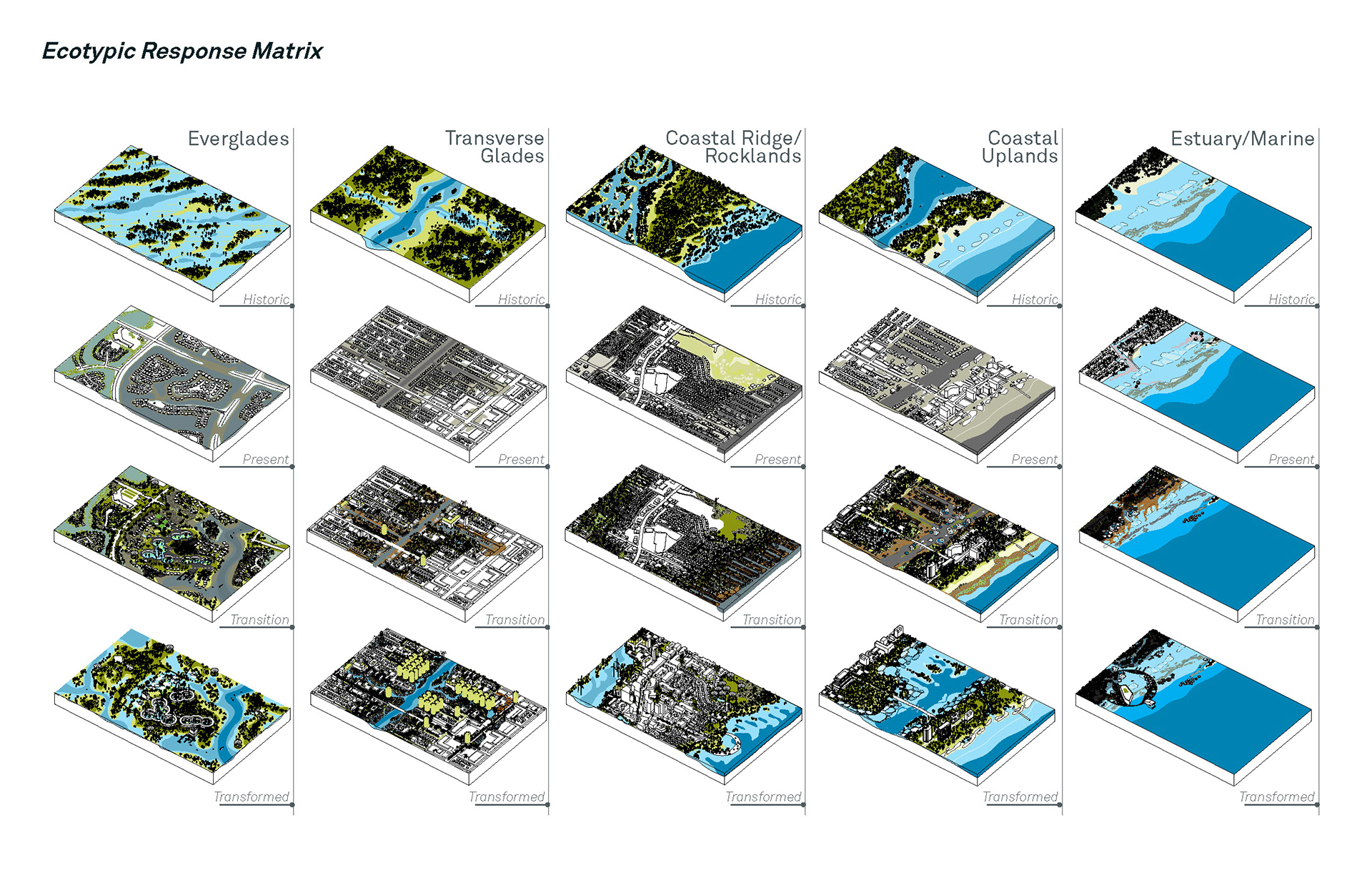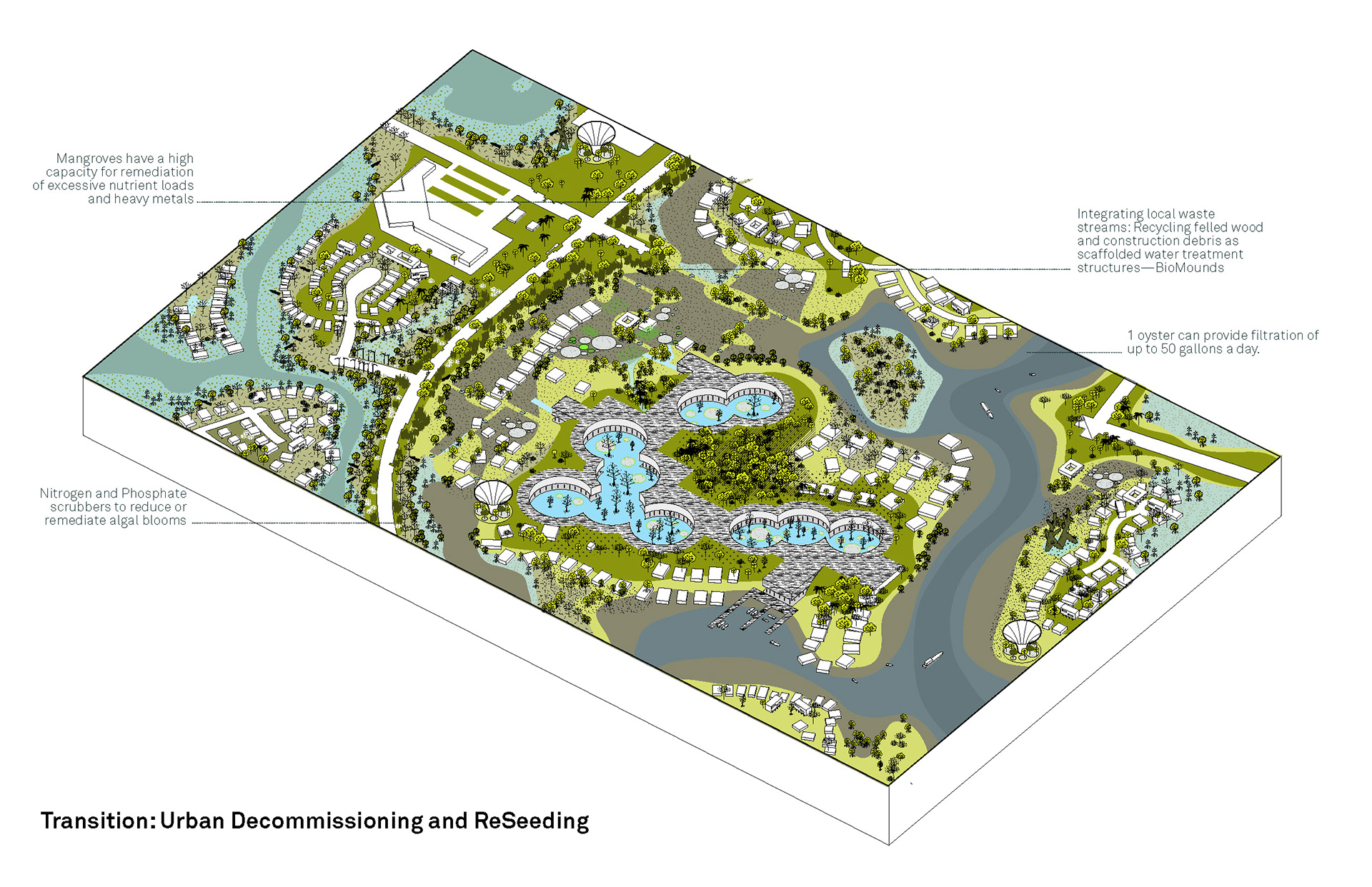 The coastal zone is home to some of our country’s most valuable ecological and socio-economic assets. Many of these locations are being demonstrably transformed due to large-scale human and biophysical processes such as urban development, climate change, and rapid sea-level rise (SLR). The result is a potential loss of myriad ecosystem services such as storm protection, wildlife habitat, recreation and aesthetics, among others. South Florida, home to the Miami metropolitan area, stretching from West Palm Beach in the north to Key West in the south, is emblematic of such conditions. Its rapidly growing population of ~6.5M, much of which sits below 10 feet NAVD88, is already experiencing a growing flood risk linked with SLR. In an inevitable future of SLR, South Florida communities will be faced with increased vulnerability due to permanent inundation, frequent heat waves, intensifying hurricanes and catastrophic die-offs. This risk is compounded by rising groundwater tables due to the region’s porous limestone geology that will cause flooding far from coastal shorelines and a complete loss of the regions drinking water supply. Policy and design solutions are not truly considering the necessary transformation that will be required to live and work within a saturated coastal environment. The old paradigm of flood management and control will need to change from prevention, to acceptance. Population will decline as businesses and individuals decide the costs are too high to maintain regional assets and decommissioning of the built environment will prove to be an enormous challenge. These challenges will transform regional tourism, housing, waste management, energy and food production. Nascent economies that emerge from climate change and SLR will form as the only viable response to living in a saturated and salt-laden landscape. Unplanning Miami redesigns the built environment through a framework of strategic decline and resettlement patterns in response to these unique challenges. A framework of resettlement and abandonment across both temporal and spatial scales as it relates to urban and landscape transformation was prepared through design thinking and technological approaches. To stay requires conventional practices of land ownership and management that promote separation from ecological networks to be questioned and translated into an unplanning framework. Development of amphibious strategies through new languages of wetness, buoyancy, tethering, anchorage, hosting (scaffolding), raising and suspension are considered. Left behind are preconceived notions of environmental control, mitigation, resistance, and permanence for a symbiotic existence, adapting to a dynamic, transitional and fluid environment.