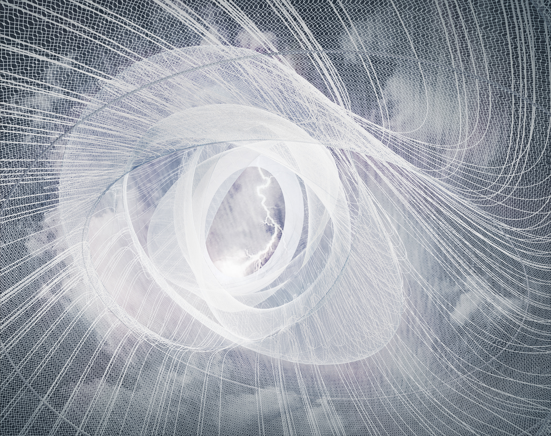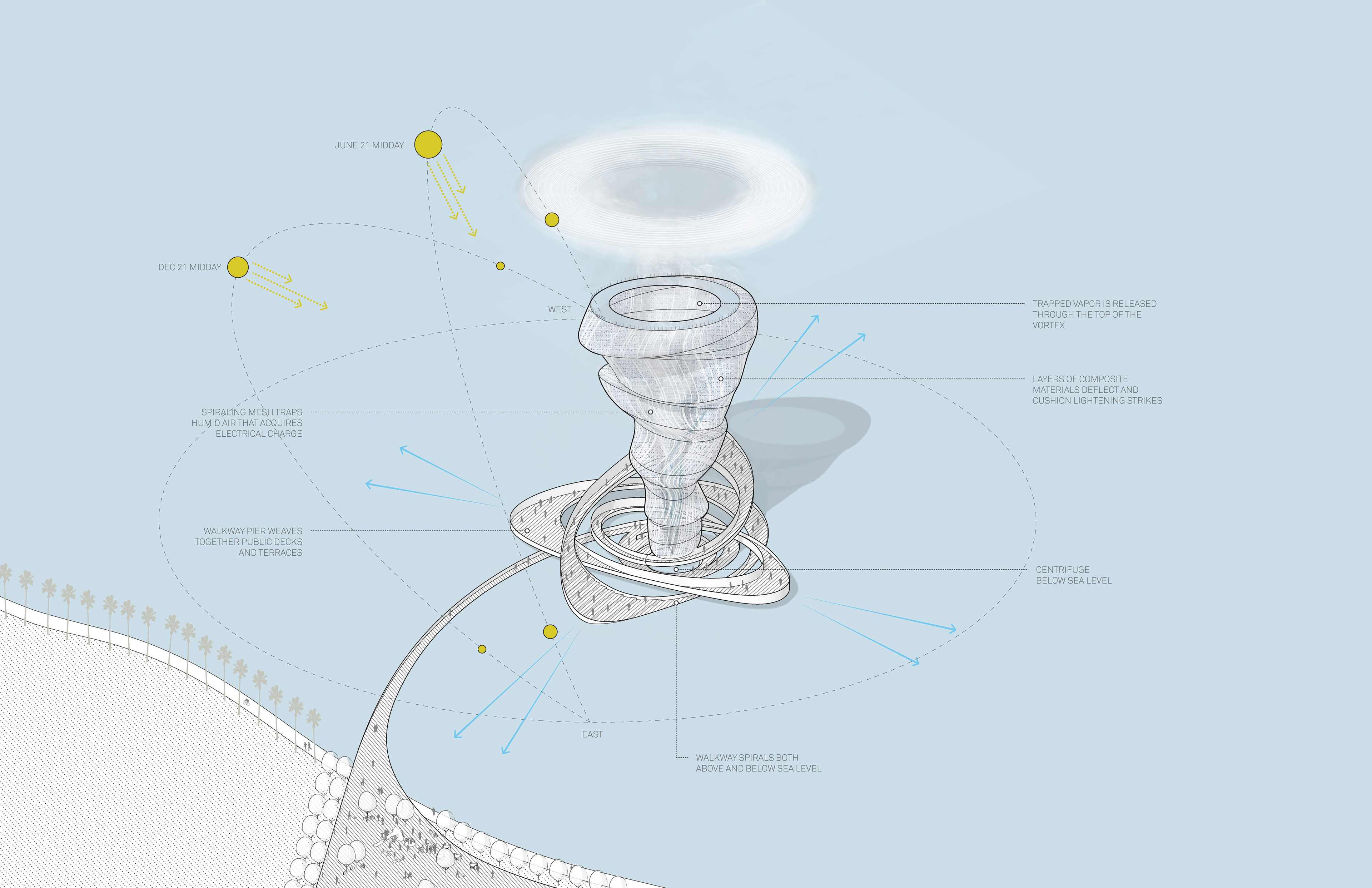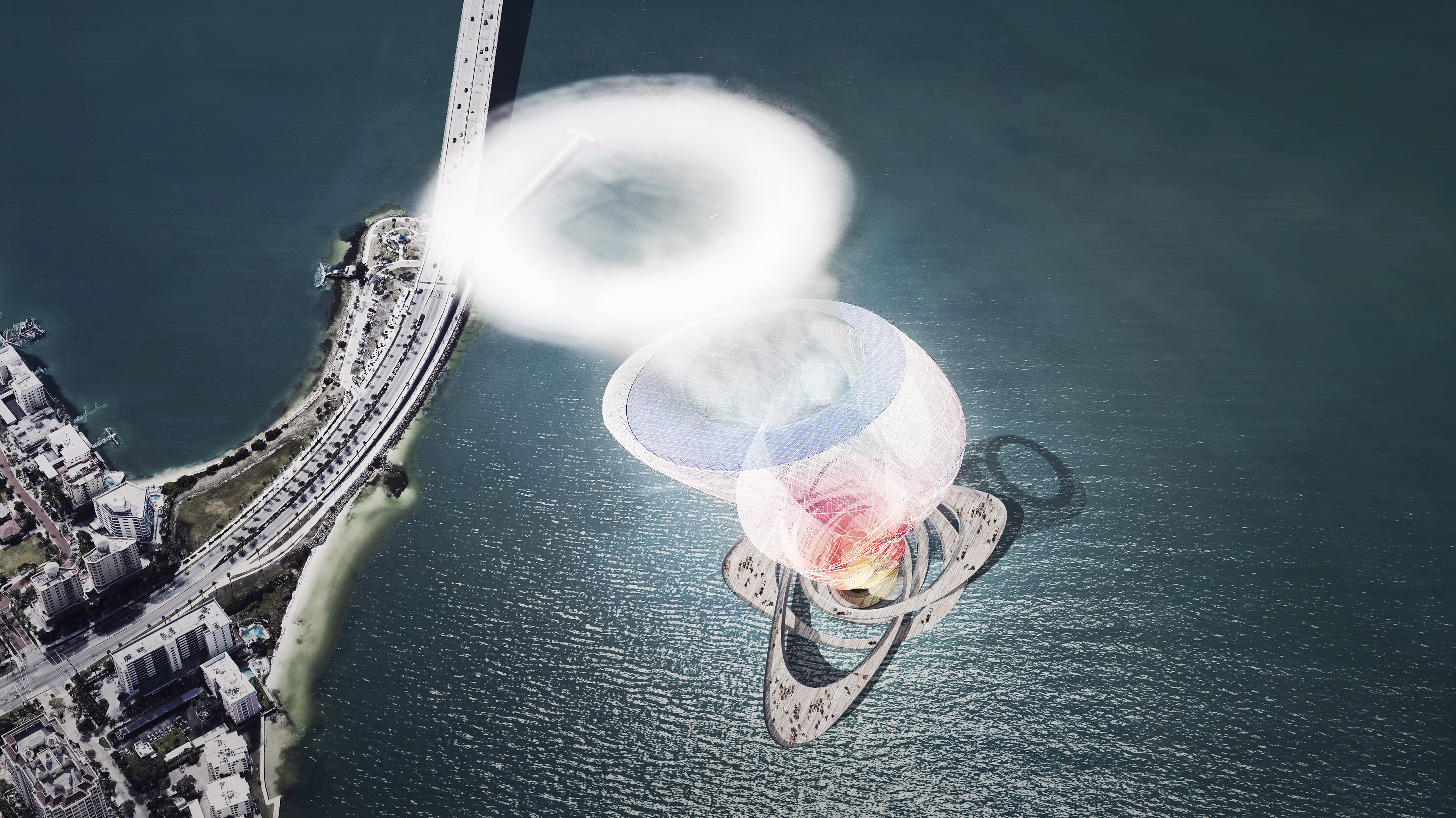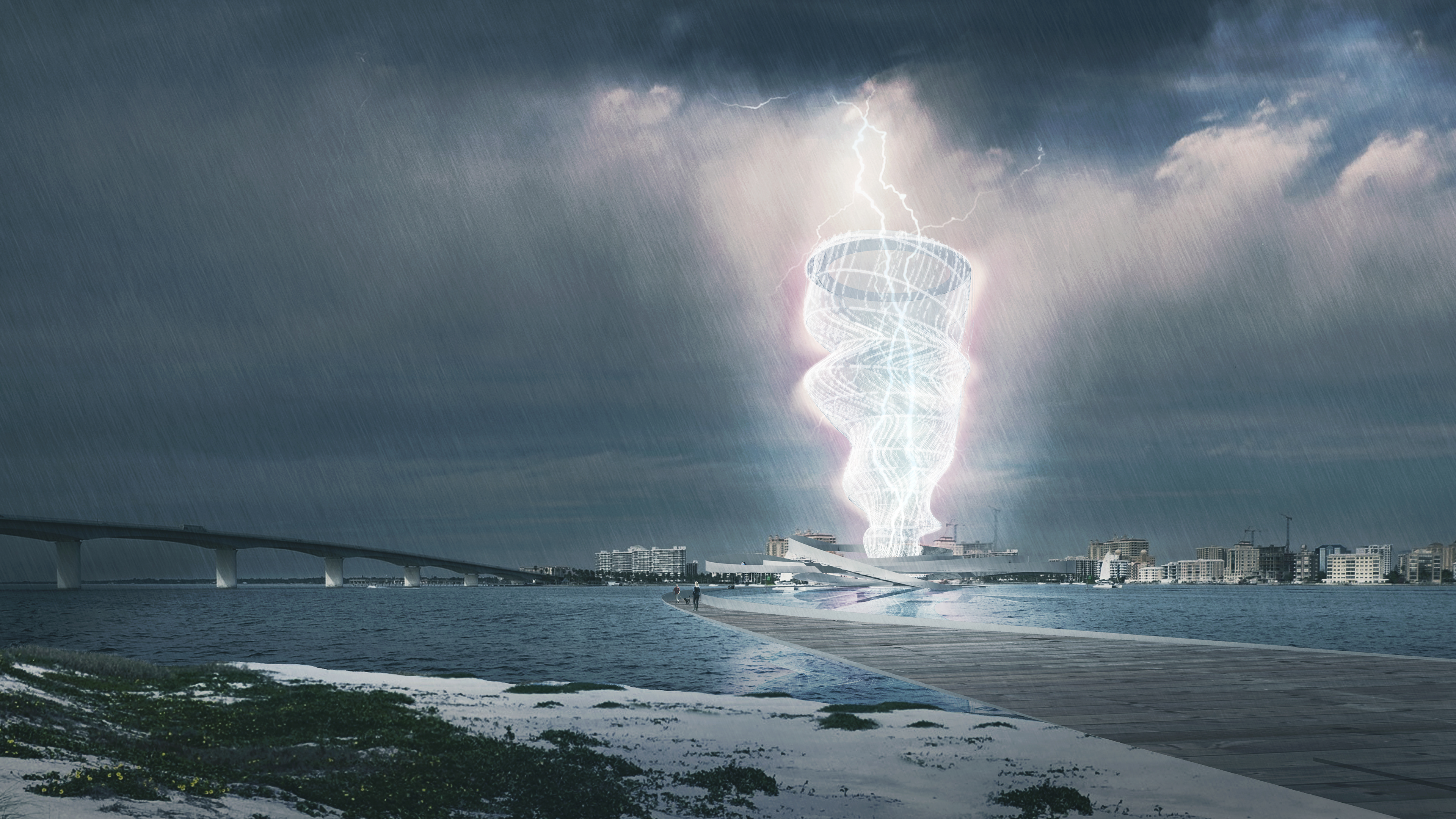 In collaboration with Dezeen and Adidas, Brooks + Scarpa has created a conceptual energy-harvesting pavilion for P.O.D.System. The P.O.D.System Architecture project calls on Los Angeles-based architects to create conceptual buildings based on the story behind adidas' recently launched P.O.D.System shoe, which combines three different shock-absorbing technologies into a single sneaker. Envisioned for Sarasota Bay, Florida, where hot sun and intense lightning storms are commonplace, the conceptual pavilion features a huge, spiralling, gas-filled structure in the centre, made from a flexible, conductive mesh material. The top of this structure features a ring of solar panels to capture energy from the sun, as well as an array of lightning rods. The funnel-like pavilion inflates when a storm approaches, rising up to attract lightning strikes, which it directs to the electrical substation below. "When the sun is out, it is essentially a deflated structure," Brooks explains. "When a storm comes across, it rises three-hundred feet to harness the energy of lightning and it become a completely different space." Vortex Generator would be accessible to the public via a walled walkway set below the water level of the bay, which rises up out of the water and spirals around the base of the inflatable structure. The central portion acts like a giant lightning rod, ensuring that no-one on the path would be struck by lightning in a storm. "Traditionally, when you're in a thunderstorm, you run for cover," Brooks says. "We wanted to flip that and provide a space for people to experience a thunderstorm while being protected."